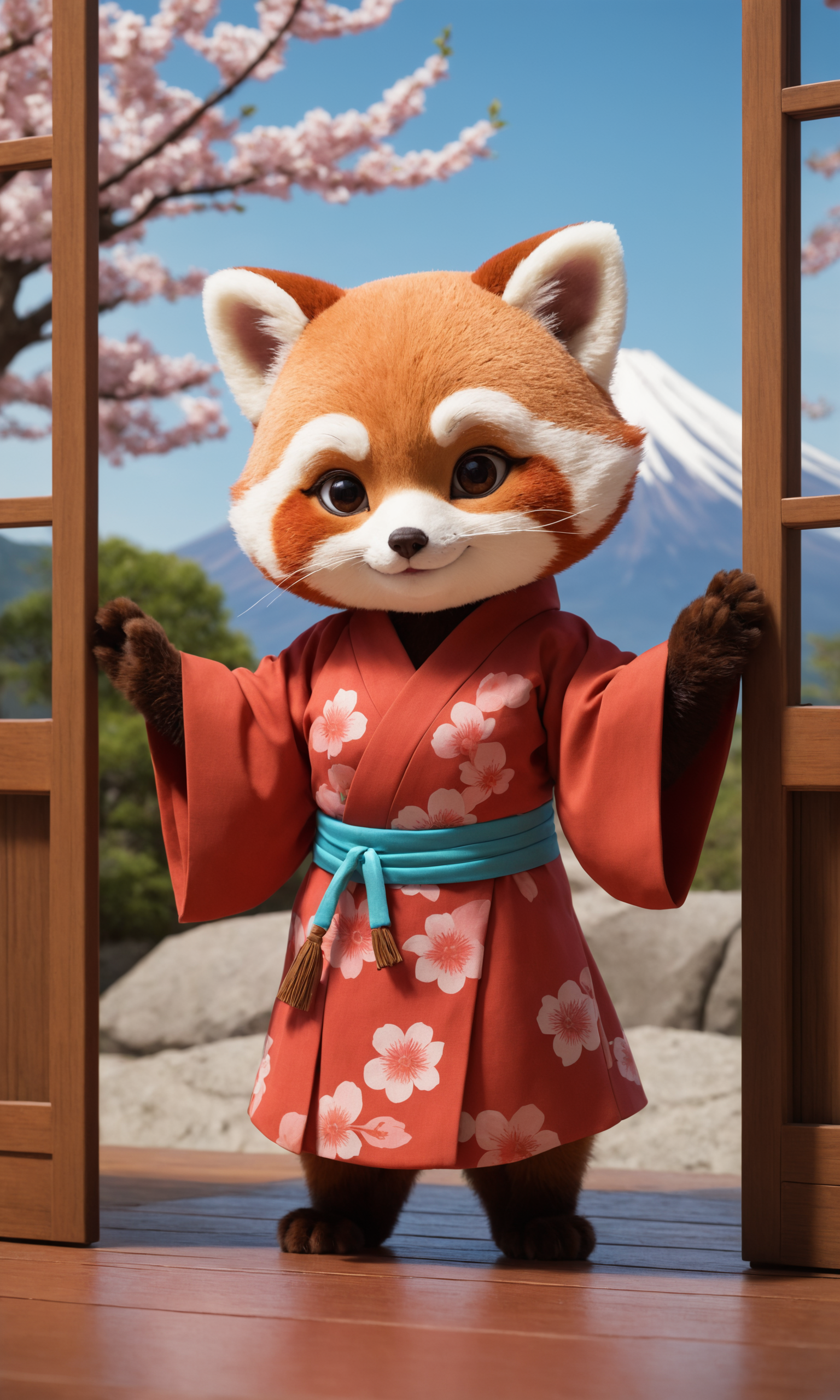 cinematic still A chibi anthro red panda girl monk in a serene 1960s dojo, an open door revealing a view of Mount Fuji with cherry blossoms in full bloom. She wears traditional monk robes, striking a dynamic pose with expressive red panda ears, round eyes, and a playful nose. Barefoot, she radiates charm and focus, blending adorably into the tranquil, flower-filled garden setting . emotional, harmonious, vignette, 4k epic detailed, shot on kodak, 35mm photo, sharp focus, high budget, cinemascope, moody, epic, gorgeous, film grain, grainy, (masterpiece), (best quality), (ultra-detailed), A chibi anthro red panda girl monk in a serene 1960s dojo, an open door revealing a view of Mount Fuji with cherry blossoms in full bloom. She wears traditional monk robes, striking a dynamic pose with expressive red panda ears, round eyes, and a playful nose. Barefoot, she radiates charm and focus, blending adorably into the tranquil, flower-filled garden setting, illustration, disheveled hair, detailed eyes, perfect composition, moist skin, intricate details, earrings, pixel-art A chibi anthro red panda girl monk in a serene 1960s dojo, an open door revealing a view of Mount Fuji with cherry blossoms in full bloom. She wears traditional monk robes, striking a dynamic pose with expressive red panda ears, round eyes, and a playful nose. Barefoot, she radiates charm and focus, blending adorably into the tranquil, flower-filled garden setting . low-res, blocky, pixel art style, 8-bit graphics, A chibi anthro red panda girl monk in a serene 1960s dojo, an open door revealing a view of Mount Fuji with cherry blossoms in full bloom. She wears traditional monk robes, striking a dynamic pose with expressive red panda ears, round eyes, and a playful nose. Barefoot, she radiates charm and focus, blending adorably into the tranquil, flower-filled garden setting, true cinematic color, dramatic light, sharp, romantic, intricate, elegant, very inspirational, stunning, highly detailed, creative, winning new classic, professional, great composition, ambient background, deep colors, inspired, rich vibrant aesthetic, perfect symmetry, clear artistic balance, gentle, innocent, magical, beautiful scenic, fascinating, intriguing