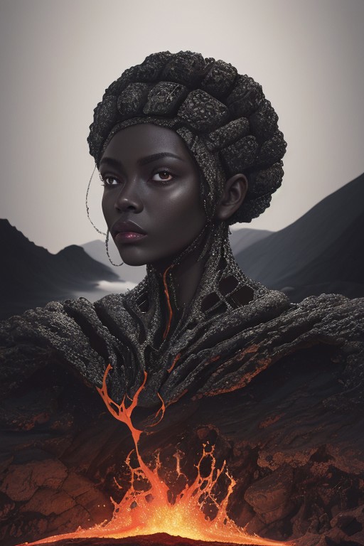 portrait of a Balenciaga african black skin model wearing a futuristic hat from an erupting volcano, flowing lava, editorial portrait, baroque dress, minimalism , soft diffused light, black stone and lava outfit, minimalism, editorial photography, surreal portrait, gradient backgrounds