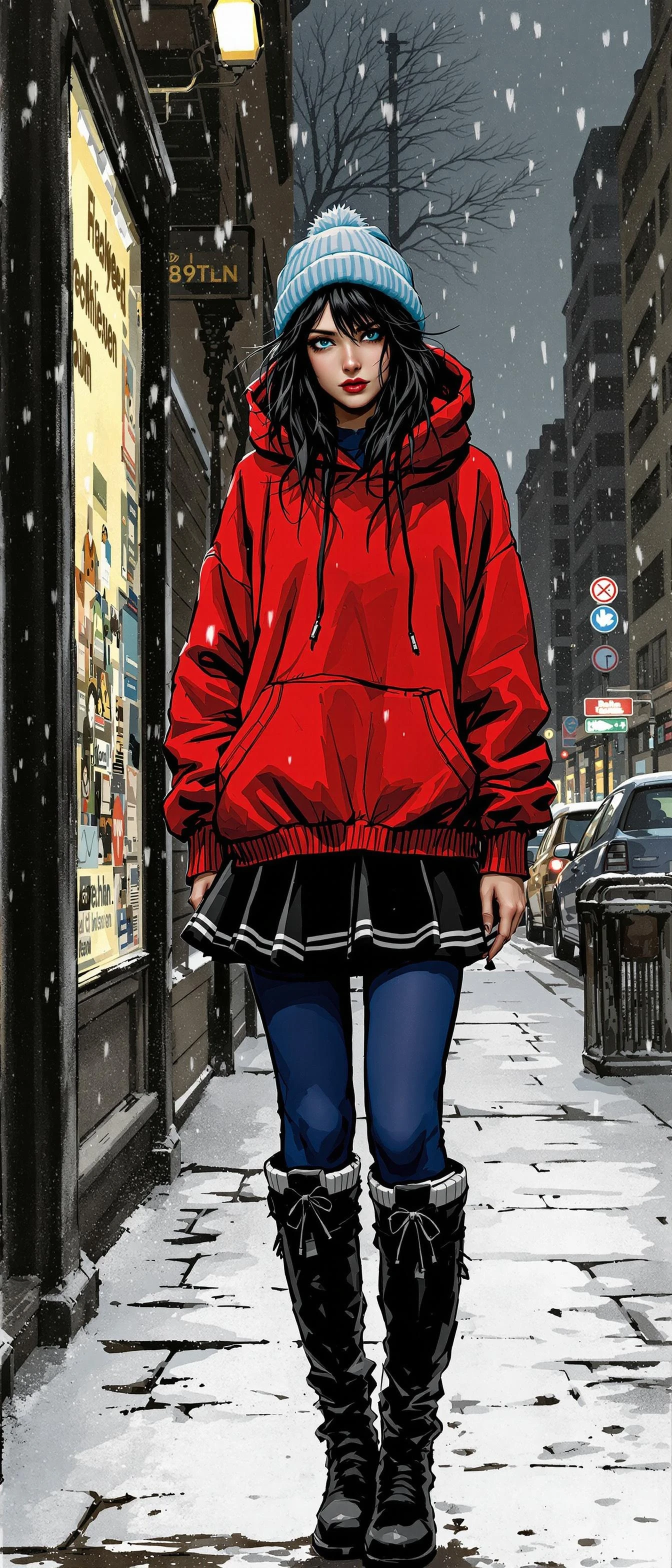 retrofuturism, Charcoal Sketch, Shadowrun setting, winter setting, standing on a desolate sidewalk in the city at dusk, snow falling lightly, wearing black knee high boots with white trim and a single black bow on each boot at the cuff, opaque blue tights, a flared black skirt which matches her boots, wearing a long sleeved red hoodie with the hood down, the sleeves are extra long so that only the tips of her fingers are visible as it appears to be too large for her body, ivory skin, Germanic Mädchen, Deutsch, messy black hair fanned over her shoulders, her sloppy bangs fall slightly over her eyes, she wears a sky blue winter hat which matches her wide eyes, dark color saturation, noire,