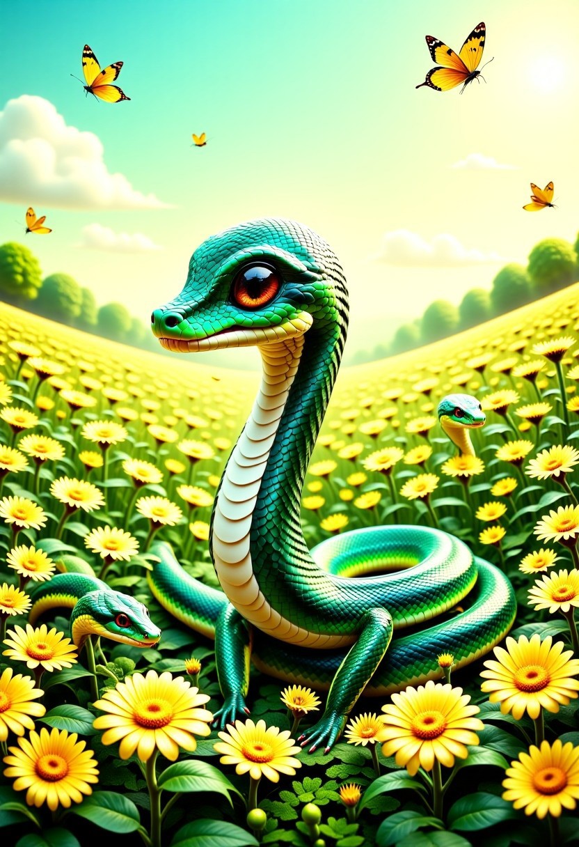 score_9, score_8, score_7, BREAK cartoon, adorable baby snake, cute snake face, amazing neon-colored snakeskin pattern, sn4k3, the baby snakes are in a sunny field of dandelions and butterflies, baby snake is friends with an cutesy cartoon version of Arthropleura the mega-centipede from the Cambrian era.
