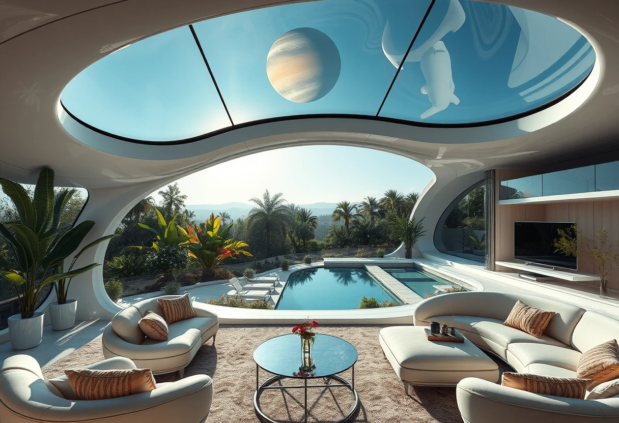 a livingromm in a futuristic building, organic streamlined architecture, much of glas and chrome, the interieur could be from a since fiction movie, the view outside shows a beautiful garden with exotic plants and a swimmingpool, its a great daylight and at the sky is a planet with rings of dust like saturn visible