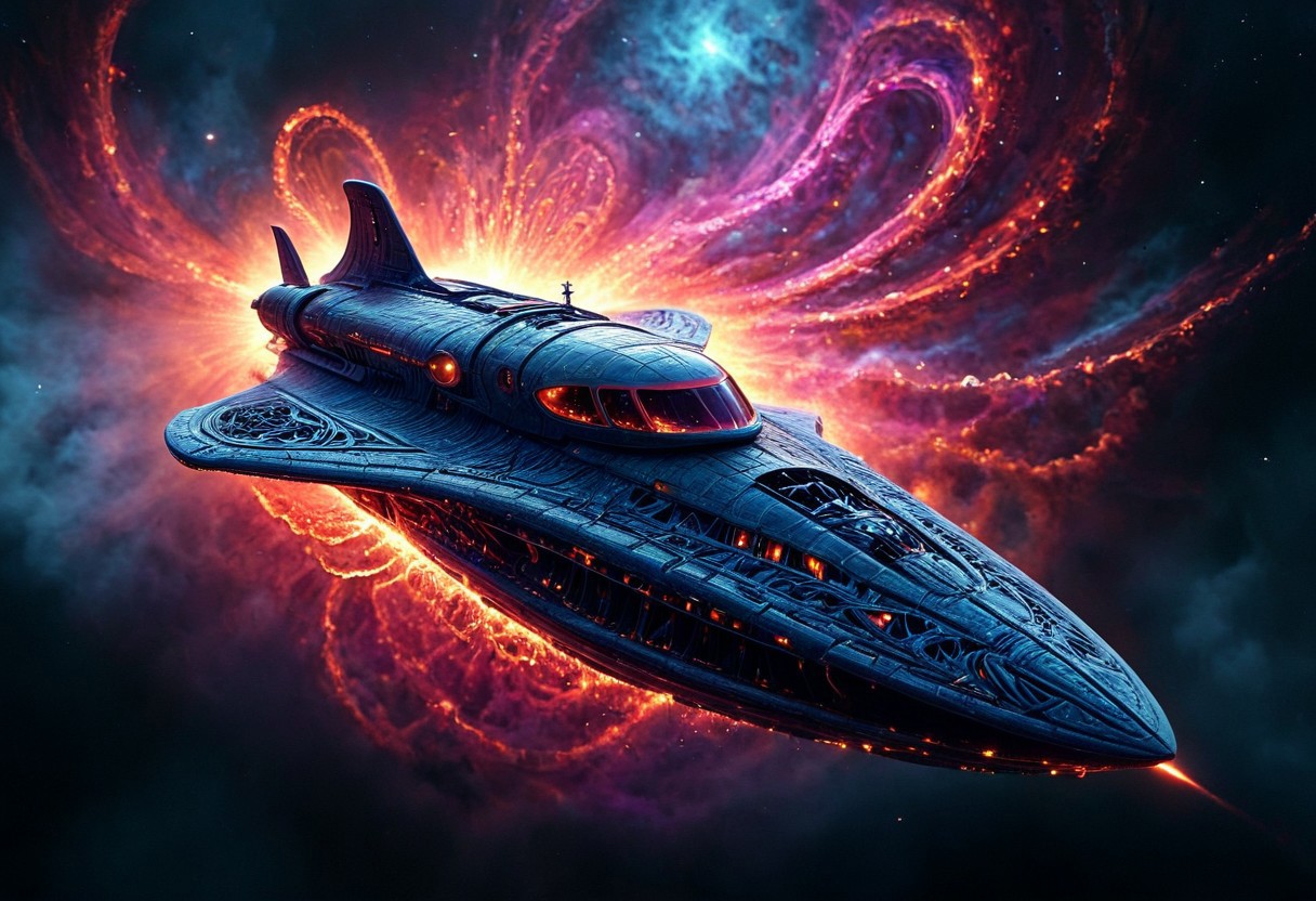 A sleek, obsidian Fractangles spaceship, its hull shimmering with captured starlight, emerges from a swirling vortex of violet and crimson energy, a testament to its recent warp jump. Intricate, fractal patterns etched across its surface subtly shift and pulse with internal light, revealing a complex network of interwoven circuitry. Debris, glowing faintly with residual warp energy, trails behind the vessel, dissipating into the inky blackness of space. The ship's powerful engines emit a low, guttural rumble, like the churning of a thousand celestial gears, reverberating through the surrounding void. Dust motes dance in the faint light emanating from the ship's breach, as the vessel, impossibly large, cuts a dramatic silhouette against the infinite expanse of the cosmos.