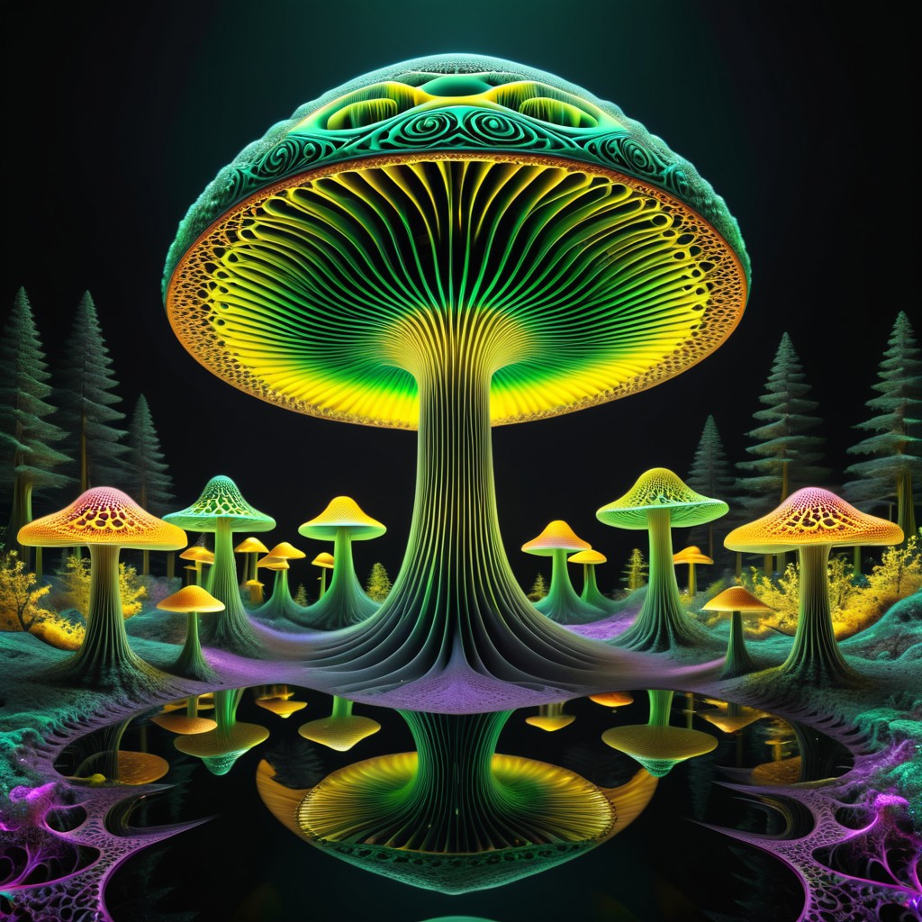 HD photo, psychedelic world, mushroom, high, fractal pattern custom paint job, vibrant green and yellow against dark grey, reflections, interesting lighting, shadows, highest quality, made out of fractangles, Fractangles