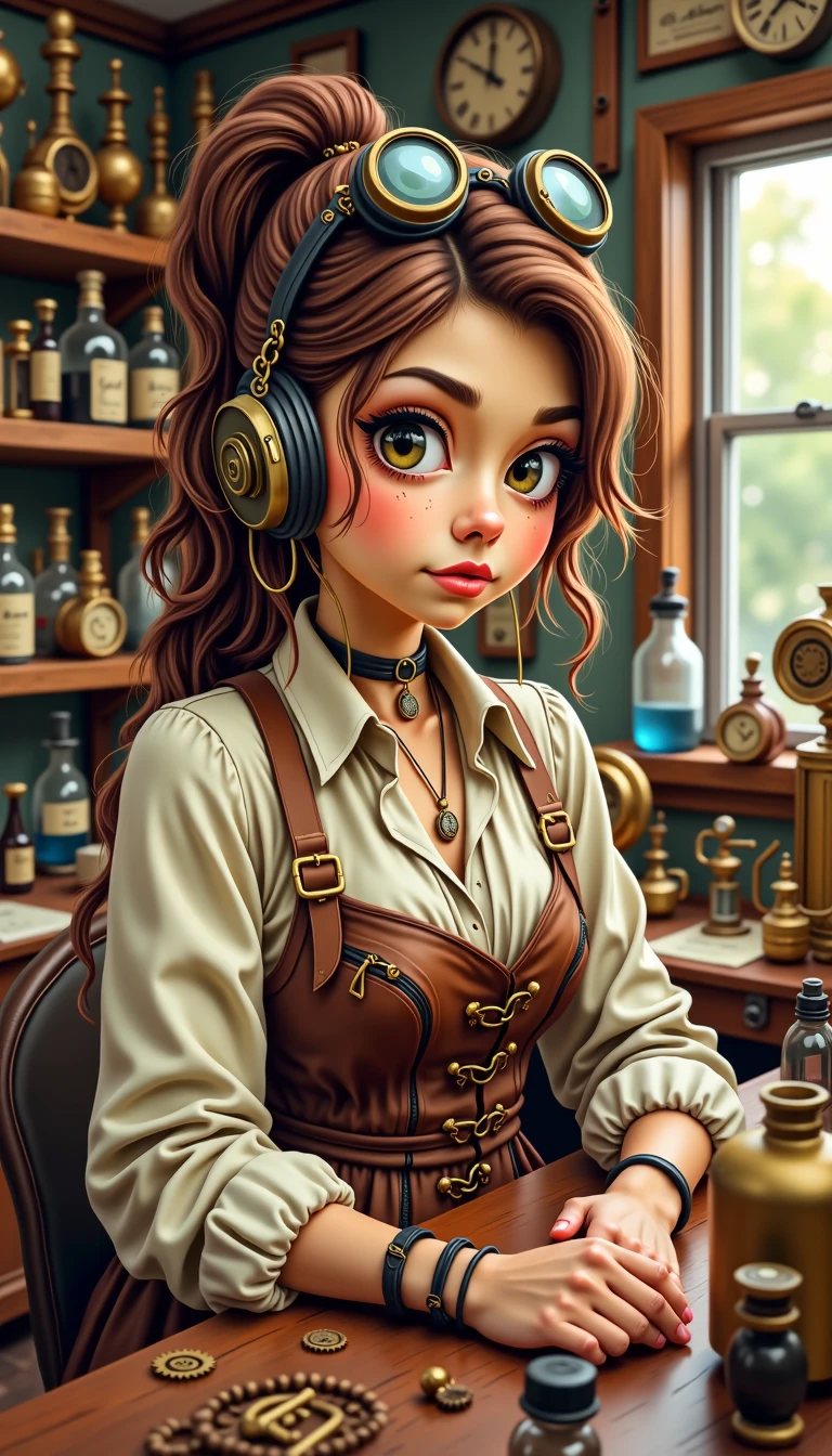Steampunk Inventor in Her Workshop: Visualize a quirky yet determined female inventor in a richly detailed steampunk workshop. She wears Victorian-inspired attire accented with gears, goggles, and leather straps. The background is filled with whimsical contraptions, brass instruments, and a warm, sepia-toned palette. The image style could be a blend of cartoonish exaggeration and intricate line art, ensuring the scene is playful yet detailed and PG-13 in tone. Shadaria Kalil,