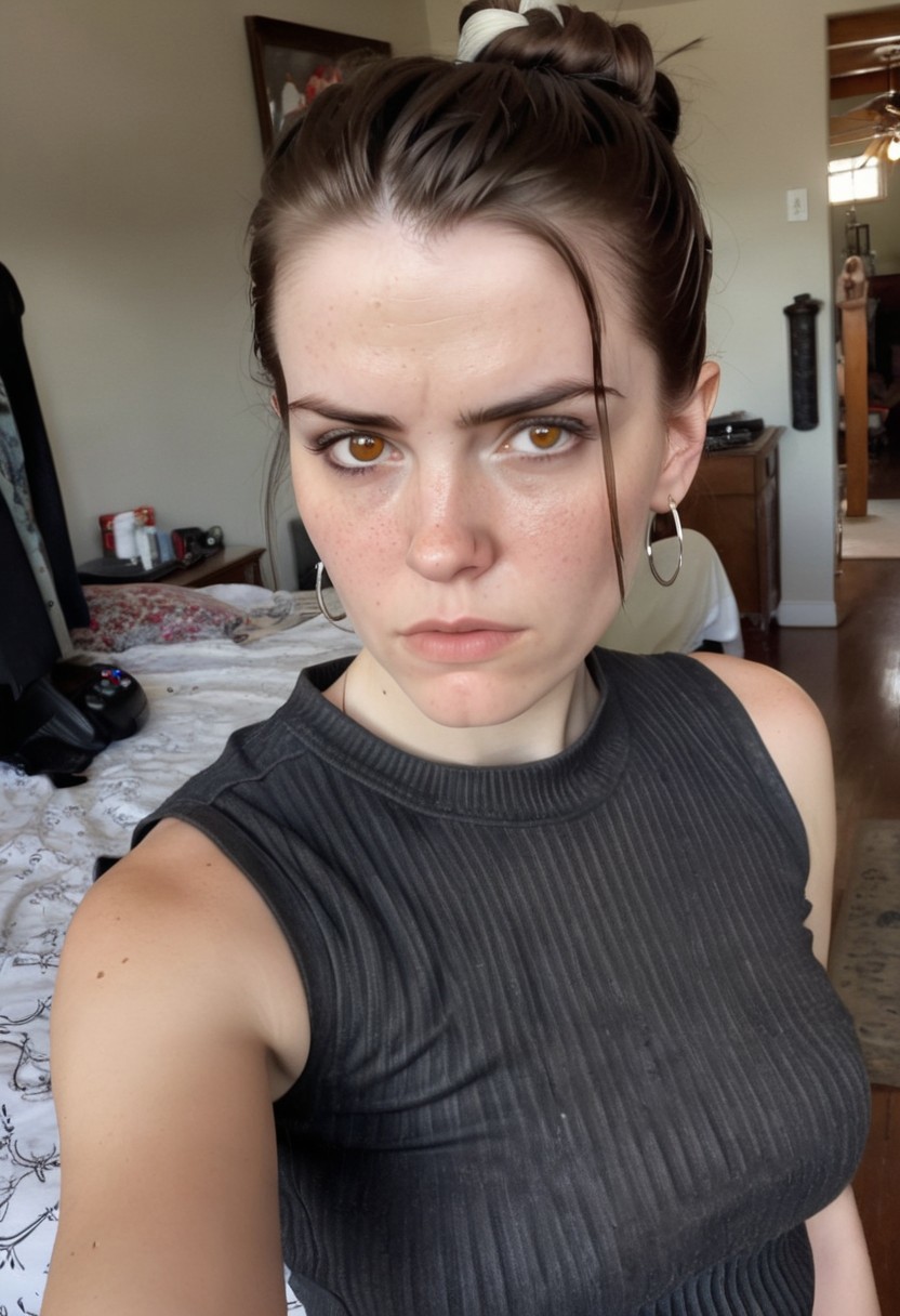Authentic share, amateur quality phone photo in bad resolution, nfsw, gothic haircut, beautiful,grainy picture, faded colors, underexposed picture, cowboy shot, front view,nfsw 40 years old, cutest face,1 solo bun, (((girl lifts her sleeveless crew cotton ribbed neck top to show her breast:1.3))), solo girl, angry face:1.2, goosebumps,ultra realistic brown eyes, (pale skin), realistic skin, ultra realistic sharp skin, freckles,brown hair, hair strictly pulled back, hair tied with a clip behind the head, silver hoop earring,