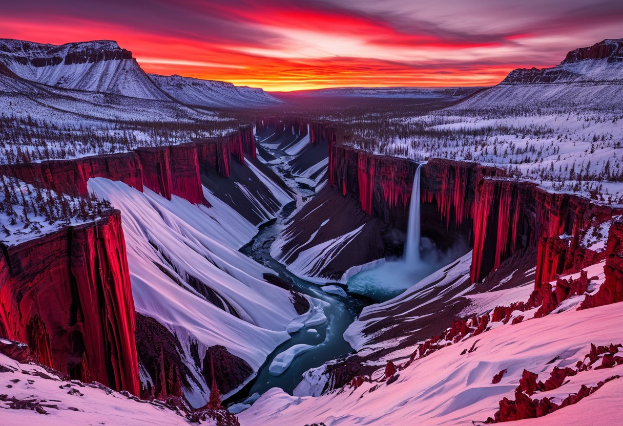 Crimson sunset bleed across a desolate, snow-covered landscape, casting long, skeletal shadow from gnarled, obsidian trees. Frozen waterfalls cling like icy veins to the cliff face, reflecting the dying light in fractured shards