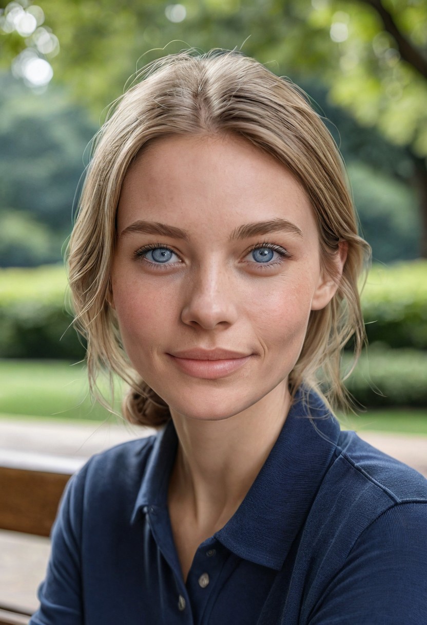 A stunning hyper realistic close up portrait of a 30-year-old beautiful supermodel with natural face, subtle wrinkles,short dark blond hair featuring detailed strands that flow with a sense of movement. Her expressive blue eyes radiate warmth and determination. She is seated in an outdoor café in Central Park in New york ,smiling gently at the camera. She is dressed in casual sport, dark solid blue polo shirt , attire that complements her elegant yet approachable demeanor. Her facial features are finely detailed, highlighting her confidence and poise. The Central Park Trees as a background
