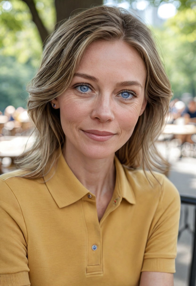 A stunning hyper realistic close up portrait of a 45-year-old beautiful supermodel with natural face, subtle wrinkles,short dark blond hair featuring detailed strands that flow with a sense of movement. Her expressive blue eyes radiate warmth and determination. She is seated in an outdoor café in Central Park in New york ,smiling gently at the camera. She is dressed in casual sport, dark solid yellow polo shirt , attire that complements her elegant yet approachable demeanor. Her facial features are finely detailed, highlighting her confidence and poise. The Central Park Trees as a background