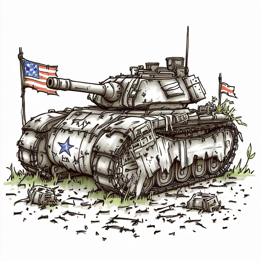 ArsMJStyle, Whimsical Mechanica, Line Drawing, The image is a black and white sketch of a military tank. The tank is in a crouched position with its body facing towards the left side of the image. It has a large gun barrel on the top with a small flag on the right side. The body of the tank is covered in rust and debris with patches of paint and dirt scattered around. There are also some plants and shrubs growing around the tank suggesting that it is in an urban area. The overall style of the sketch is rough and sketchy with bold lines and shading., ground vehicle, motor vehicle, no humans, military vehicle, tank, military, grass, flag, vehicle focus, caterpillar tracks <lora:Whimsical_Mechanica_Line_DrawingSDXL:1>