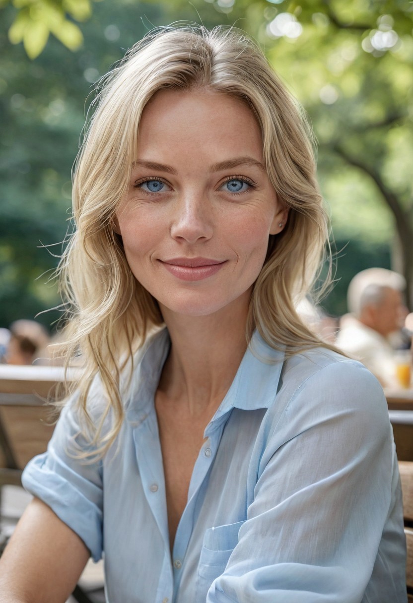 A stunning hyper realistic close up portrait of a 40-year-old beautiful supermodel with natural face, subtle wrinkles,short light blond hair featuring detailed strands that flow with a sense of movement. Her expressive blue eyes radiate warmth and determination. She is seated in an outdoor café in Central Park in New york ,smiling gently at the camera. She is dressed in casual sport, solid light bue flowing blouse, attire that complements her elegant yet approachable demeanor. Her facial features are finely detailed, highlighting her confidence and poise. The Central Park Trees as a background