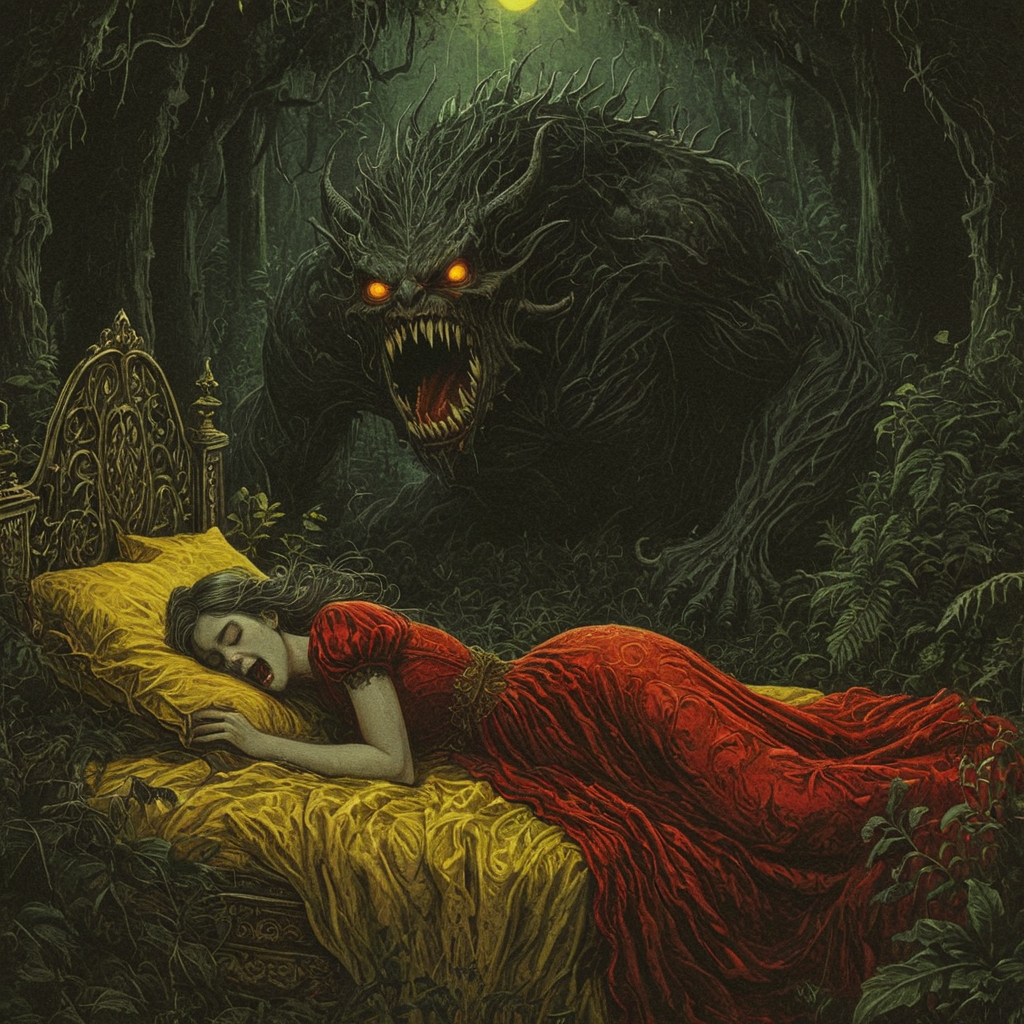 dark fantasy art style, a drawing illustrations of woman in a red dress sleeping on an ornate bed surrounded by dense foliage, behind her a hideous monster with glowing yellow eyes and sharp teeth emerges from the dark forest, grainy, painterly texture