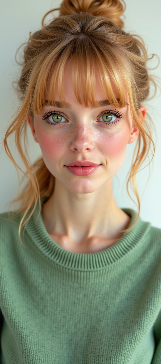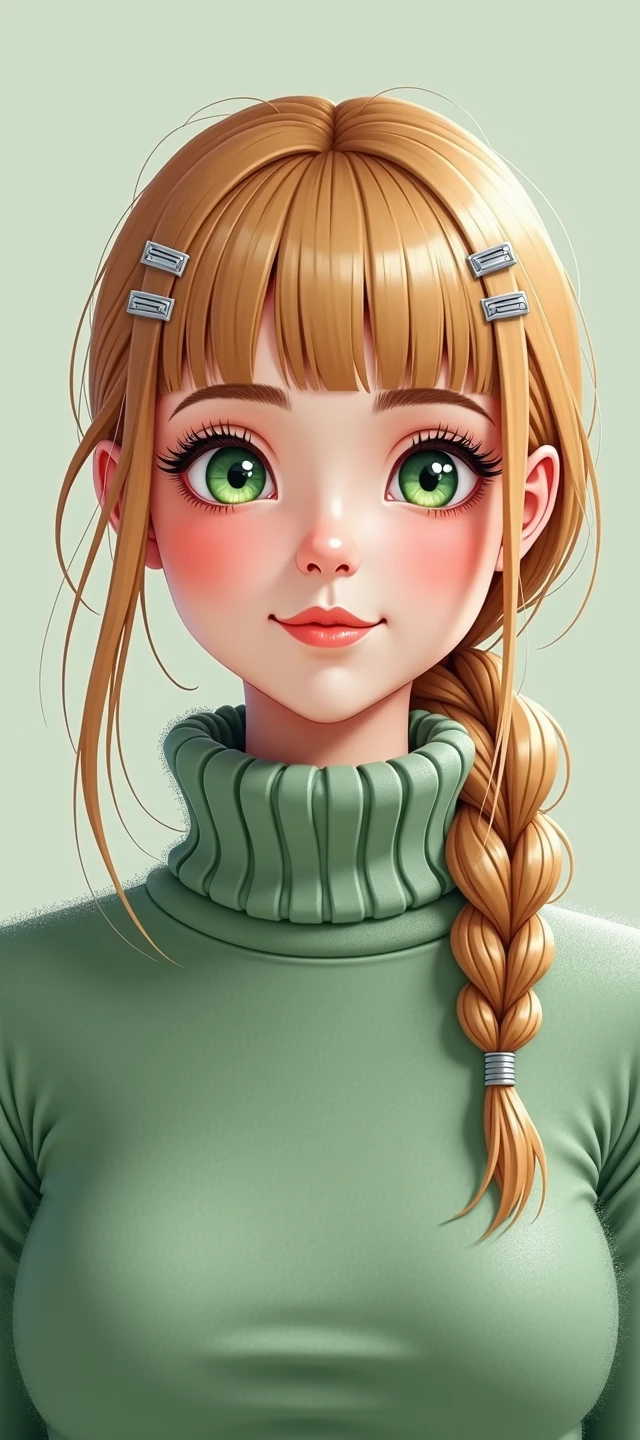 Matte finish. Concept art. Hyper Realistic Sketch. Art style of Anna Nikonova. Minimalist masterpiece. Muted Pastels. A woman with light strawberry blonde hair, glossy hair, lime green eyes, blunt bangs, hair pulled behind her ear, silver hair clips, confident, smile, beautiful, fair skin, happy, wearing a U neck fuzzy heather green sweater, eyes in focus, matte tones, portrait, sharp, background out of focus,
