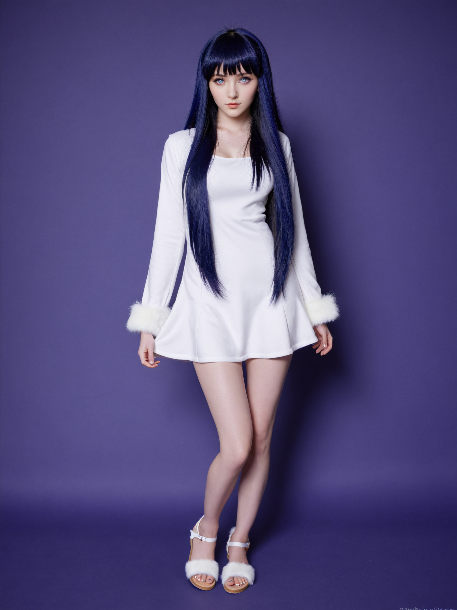 <lora:RokuPrime:1>,RokuPrime,realistic,, lavender-white eyes,(featureless eyes:1.3),dark blue eyes,very_long_hair,fair skin complexion,petite,slender,lavender clothing,white clothing,fur trim clothing,dark blue clothing,open-toed sandals,<lora:Hinata Hyuuga:1>,hhwiafu,blue hair,hair bangs,black hair,photo background,1girl,medium breasts,