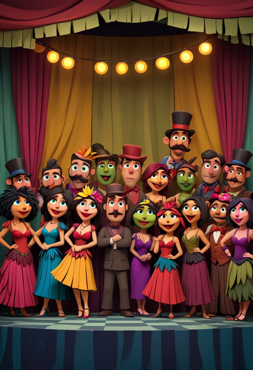 funny, complex scene, HD, Concept art,hd, 8k, masterpiece, award winning illustration of a funny puppet show, puppets made of cay, exotic dancers, background made of clay, novuschroma51 style rating_pg,