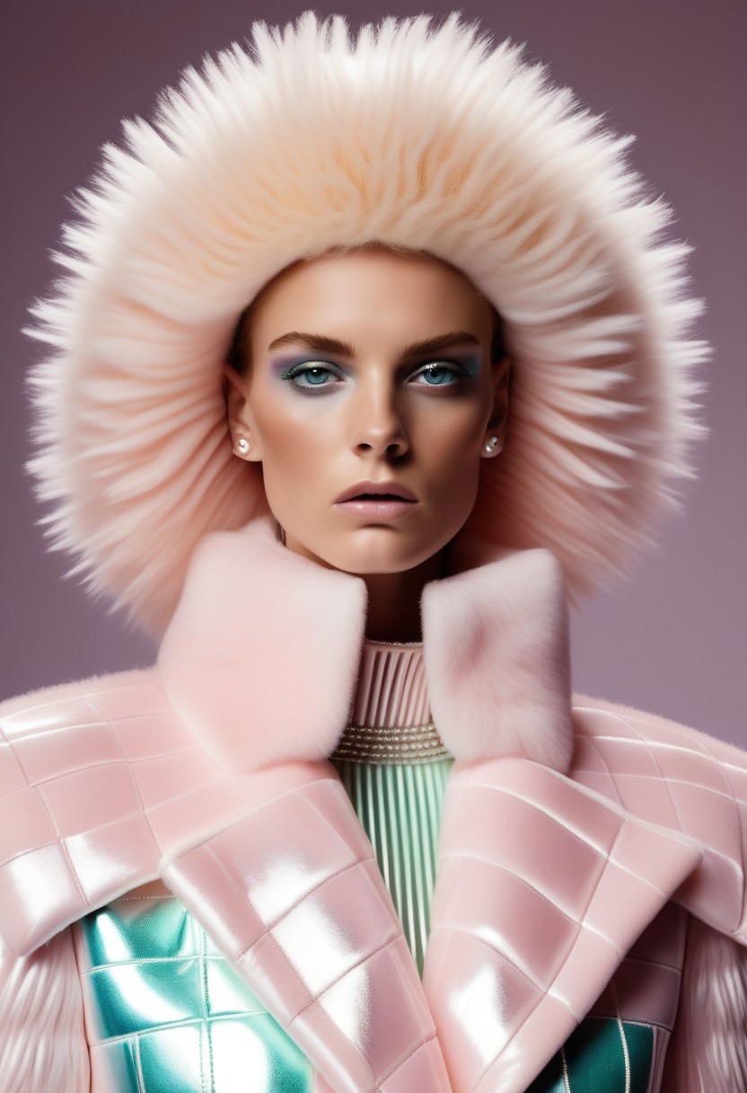 high fashion irish woman, top model portrait, haute couture fashion outfit, pastel elegance, by Jeremy Scott, Dramatic lighting, Ogham, Pearlescent colors, Fluffy texture Andre Courreges's fashion design depicting