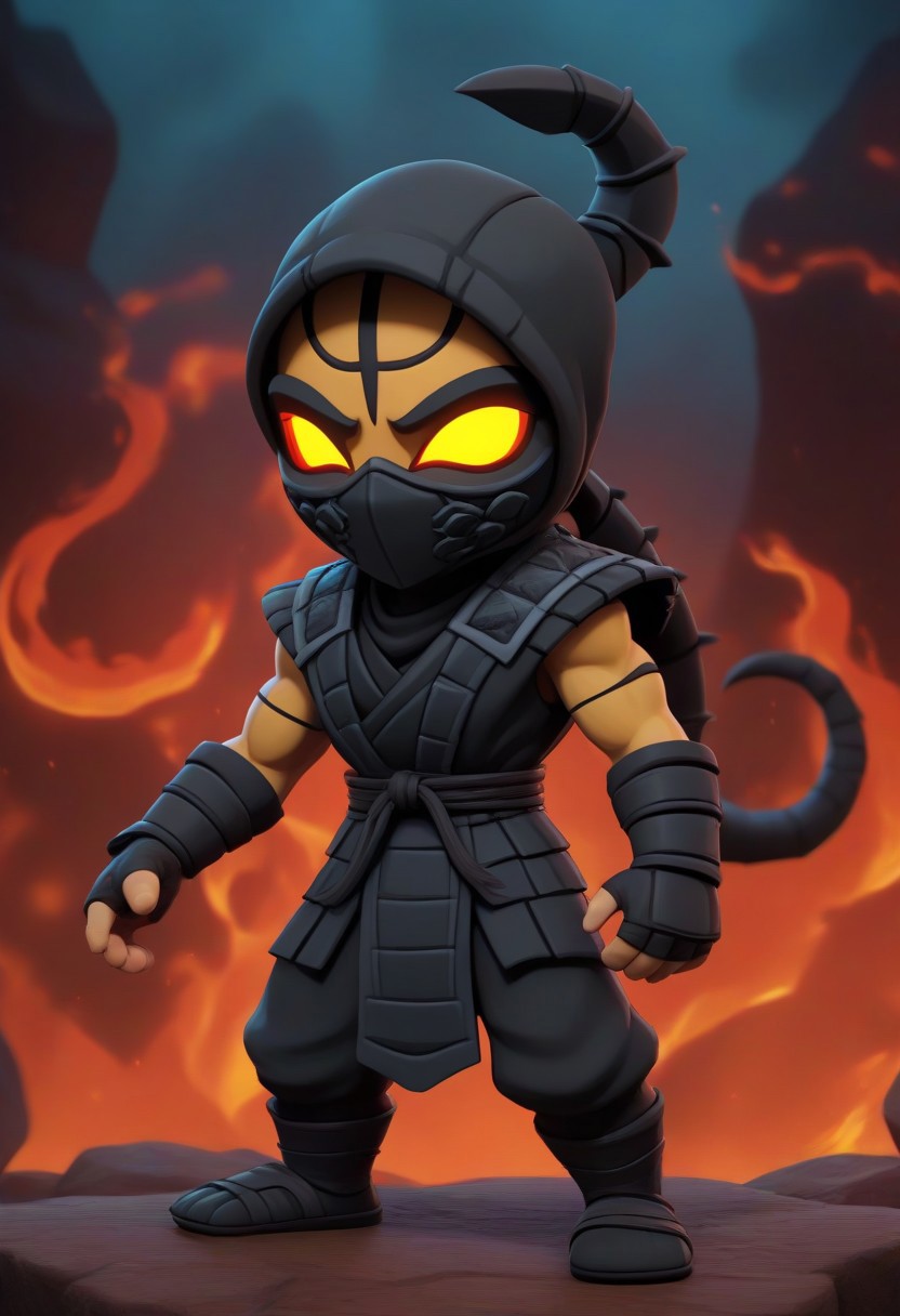 novuschroma51 style,claymation Scorpion from mortal Kombat, Chibi , ninja, mask, fiery background, masterpiece, best quality, amazing quality, very aesthetic, absurdres, newest,