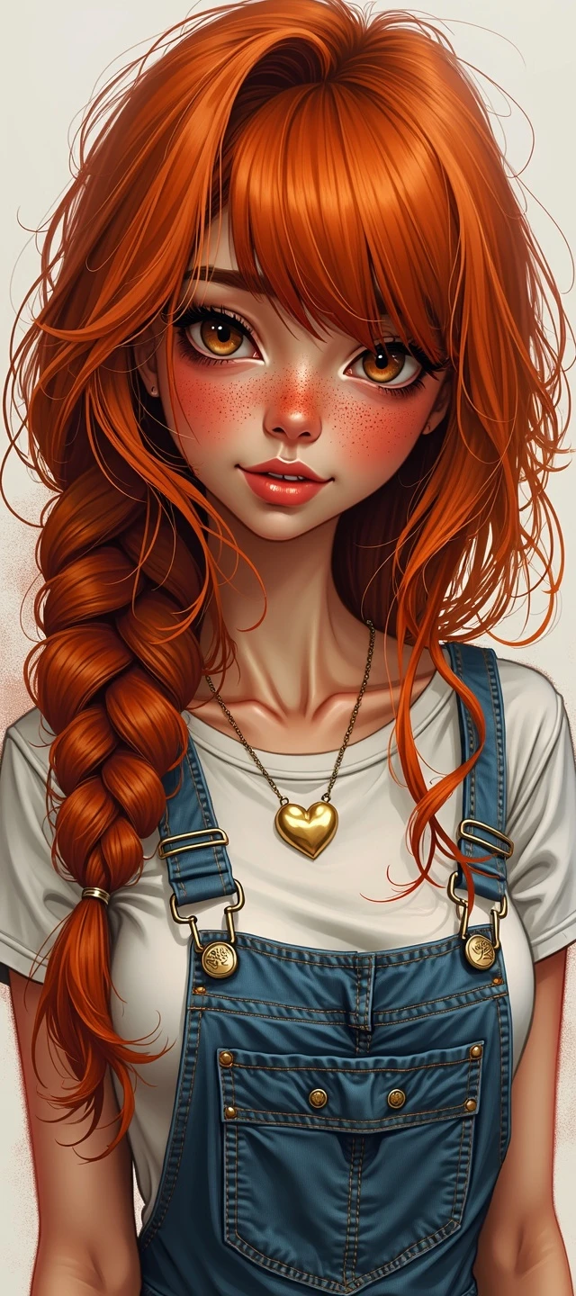 Matte finish. Concept art. Hyper Realistic Sketch. Art style of Anna Nikonova. Vibrant, A woman with long layered bright red hair, her hair obscures one eye, her long fluffy bangs frame her face, the rest of her hair is pulled into a loose low braid, she has prominent freckles, shy smile, hazel eyes, round cheeks, thick bushy eyebrows, wearing a white t- shirt under denim overalls, wearing a gold heart necklace on a thin chain, Dark outlines. Eyes in Sharp Focus. Portrait. Background out of focus