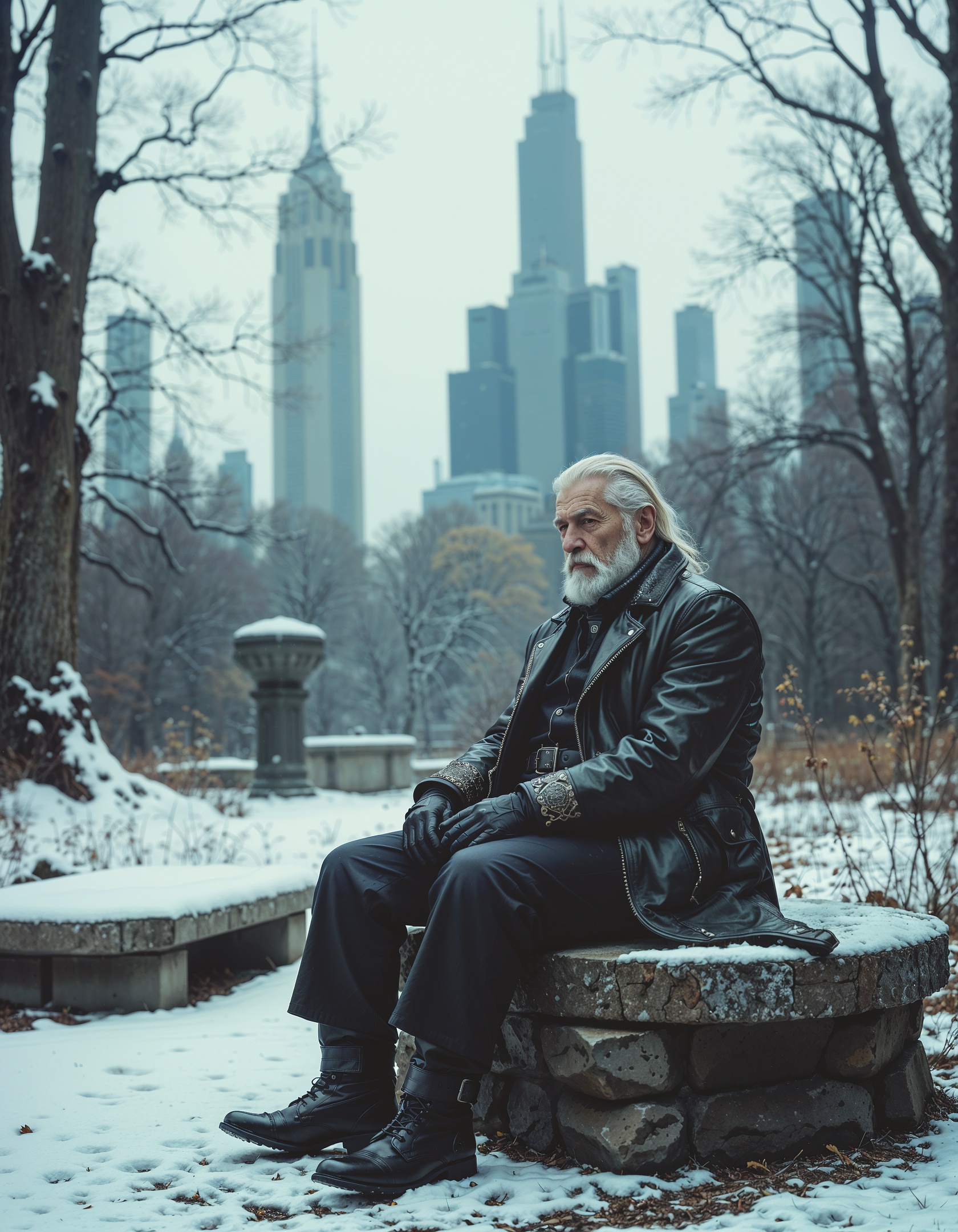 Cinematic scene of a dystopian cityscape with skyscrapers, industrial vibes, cloudy sky, snow on the ground, old man sitting on a bench in the park, wearing extravagant leather jacket, black pants, white beard, winter, dead trees, luxurious and art deco while yet dystopian. <lora:80s_Fantasy_Movie:1> ArsMovieStill, 80s Fantasy Movie Still