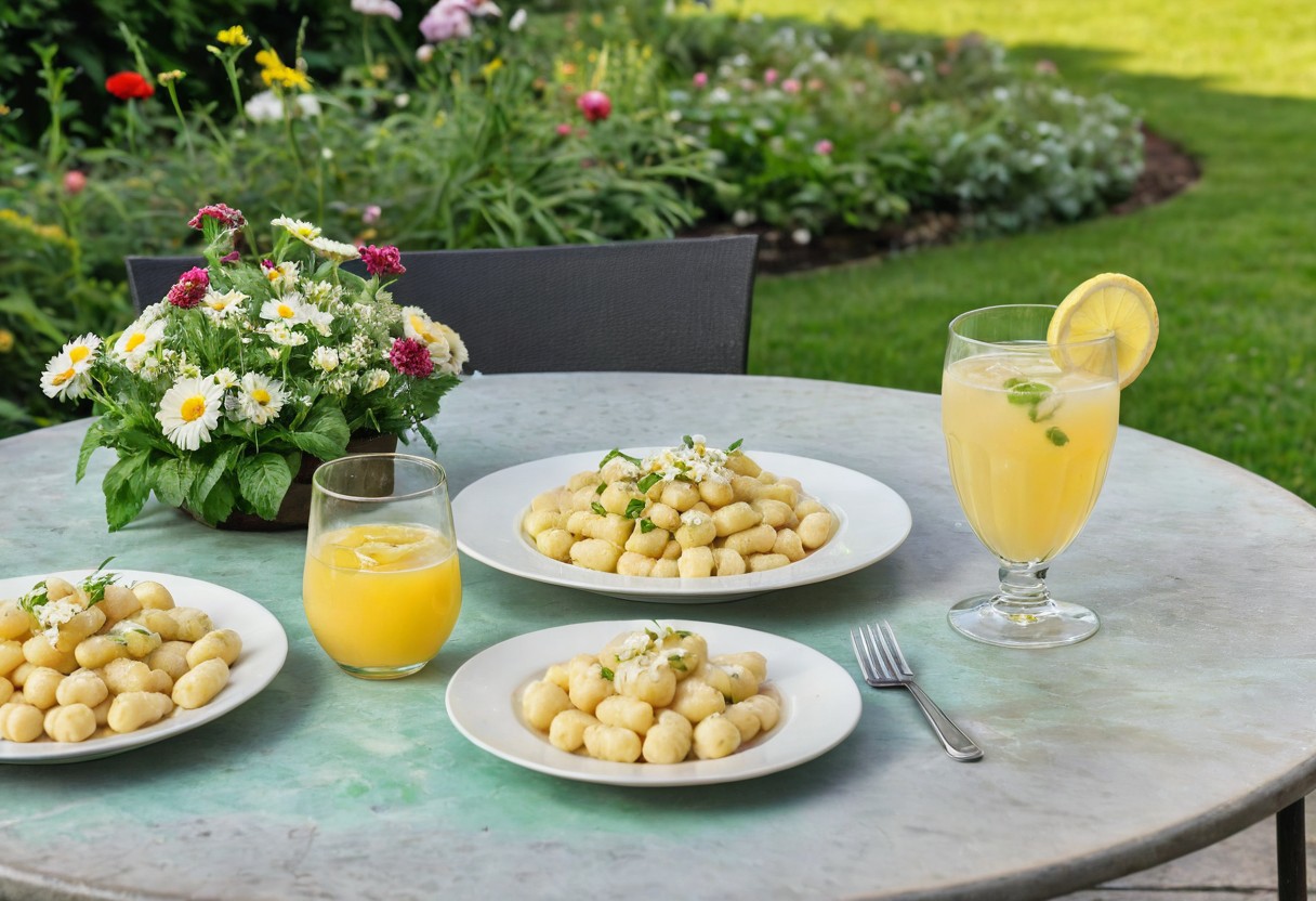 an hyperrealistic dish of gnocchi and a glass of lemonade, in a table on a terrace near a beautiful lawn, with flowers.