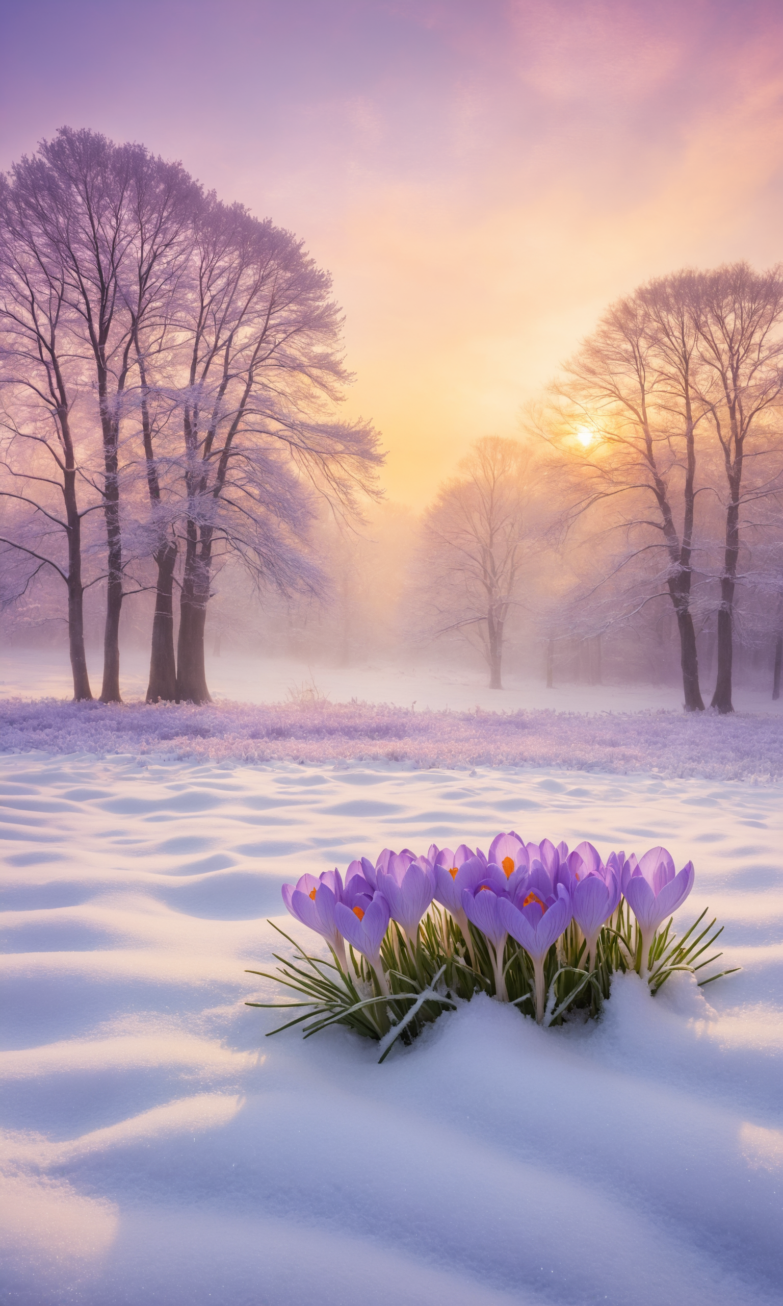 cinematic still Picture a delicate purple crocus flower pushing through a blanket of glistening snow in a serene open field. The scene is illuminated by the soft glow of twilight, with light cascading in hues of gold and lavender. In the distance, a mystical forest stands shrouded in gentle mist, its towering trees adorned with a faint shimmer of frost. The composition, rendered as a detailed oil painting, captures the quiet magic of natureâs resilience and the promise of spring.âââ . emotional, harmonious, vignette, 4k epic detailed, shot on kodak, 35mm photo, sharp focus, high budget, cinemascope, moody, epic, gorgeous, film grain, grainy, neonpunk style Picture a delicate purple crocus flower pushing through a blanket of glistening snow in a serene open field. The scene is illuminated by the soft glow of twilight, with light cascading in hues of gold and lavender. In the distance, a mystical forest stands shrouded in gentle mist, its towering trees adorned with a faint shimmer of frost. The composition, rendered as a detailed oil painting, captures the quiet magic of natureâs resilience and the promise of spring.âââ . cyberpunk, vaporwave, neon, vibes, vibrant, stunningly beautiful, crisp, detailed, sleek, ultramodern, magenta highlights, dark purple shadows, high contrast, cinematic, ultra detailed, intricate, professional, Picture a delicate purple crocus flower pushing through a blanket of glistening snow in a serene open field. The scene is illuminated by the soft glow of twilight, with light cascading in hues of gold and lavender. In the distance, a mystical forest stands shrouded in gentle mist, its towering trees adorned with a faint shimmer of frost. The composition, rendered as a detailed oil painting, captures the quiet magic of natureâs resilience and the promise of spring.âââ, extremely artistic, complimentary colors, perfect symmetry, sharp focus, beautiful detail, intricate, very creative, appealing, cute, confident, iconic, best, stunning, surreal