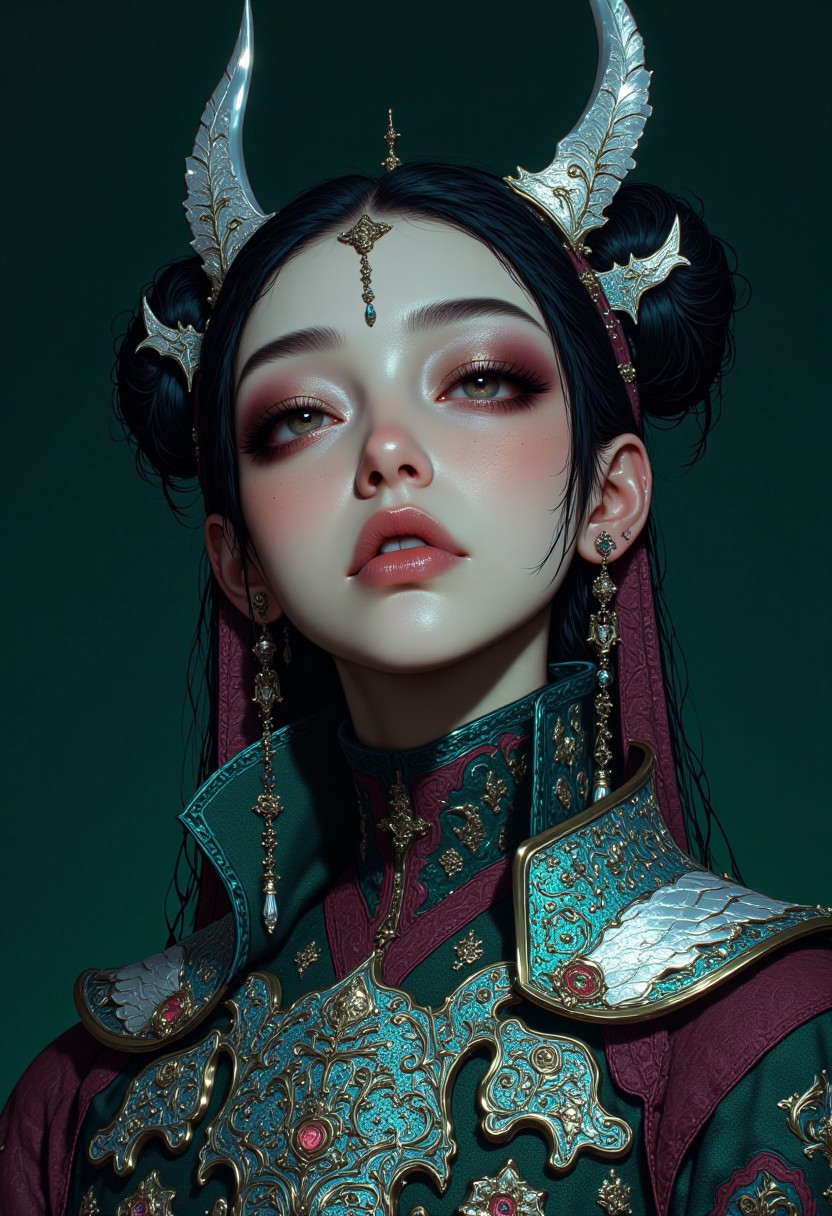 A highly detailed, hyper-realistic digital illustration presenting a close-up portrait of an ethereal East Asian woman with porcelain-like, almost translucent skin. Her delicate features are accentuated by minimal makeup, with large, expressive eyes slightly upturned, framed by thick, dark lashes and a touch of soft lavender eyeshadow. Her full lips, slightly parted, have a muted mauve hue, adding to her dreamlike presence. Her intricately braided twin buns, adorned with iridescent beads and delicate silver feathers, extend outward like curved antlers, enhancing the surreal, mythical quality of her appearance. She wears a high-collared Qing dynasty-style garment in deep emerald, burgundy, and silver, embroidered with elaborate Aztec patterns and mythical creature motifs. Over the garment, she wears a sculpted chrome silver breastplate with intricate patterns, shimmering under the light with a reflective, almost otherworldly effect. The luxurious, slightly textured fabric beneath catches the glow, emphasizing its fine craftsmanship. Toxic neon colors pulse and glow subtly along the edges of her attire, casting an eerie, luminescent aura that enhances the surreal atmosphere. The background is a gradient of rich teal, deepening towards the edges, creating a striking contrast that amplifies her presence. The fusion of realism and fantasy in her poised expression and intricate attire creates a mesmerizing composition.