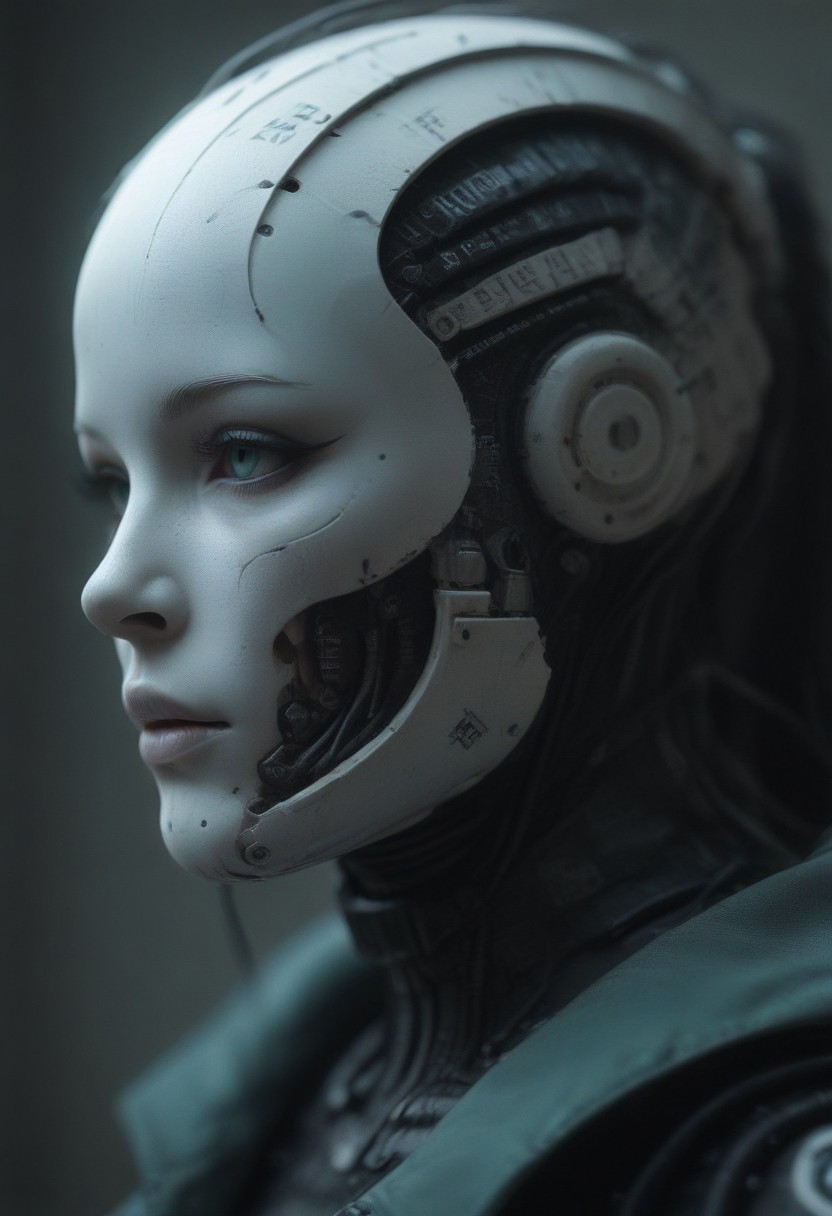 mad-shingles parts, wires, cables, cyberpunk, closeup portrait of a woman with a robot face, pastel teal/white colored, assassinkahb style, closeup photo of an wired-cyborg assassin with robot face wearing a pink high collar hooded parka with technical macro writing resembling an qr-code//bar-code on the back, solo, woman, high collar parka, upper body,, female focus, black long hair in wind, weapon, clothes writing, flag
