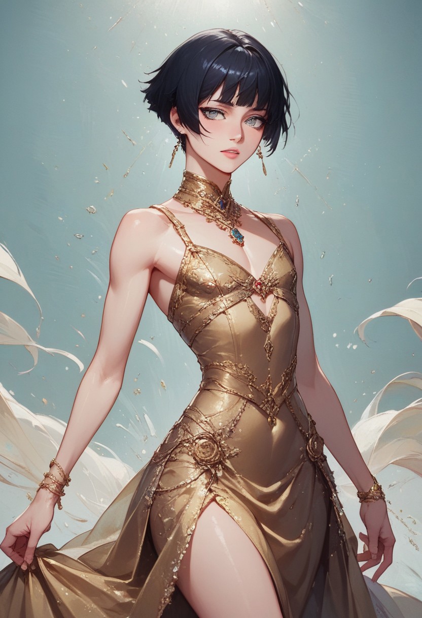 score_9, score_8_up, score_7_up, 1boy, femboy, otoko no ko, short hair, bob cut hair, black hair, grey eyes, gray eyes, feminine face, toned body, Shelly, long silver and gold dress, ball gown, flowing gown, elegant dress, straps, expensive jewelry, highly detailed, intricate, zzCitronCAT, model pose, serene expression, cowboy shot, modelshoot, abstract background, solo