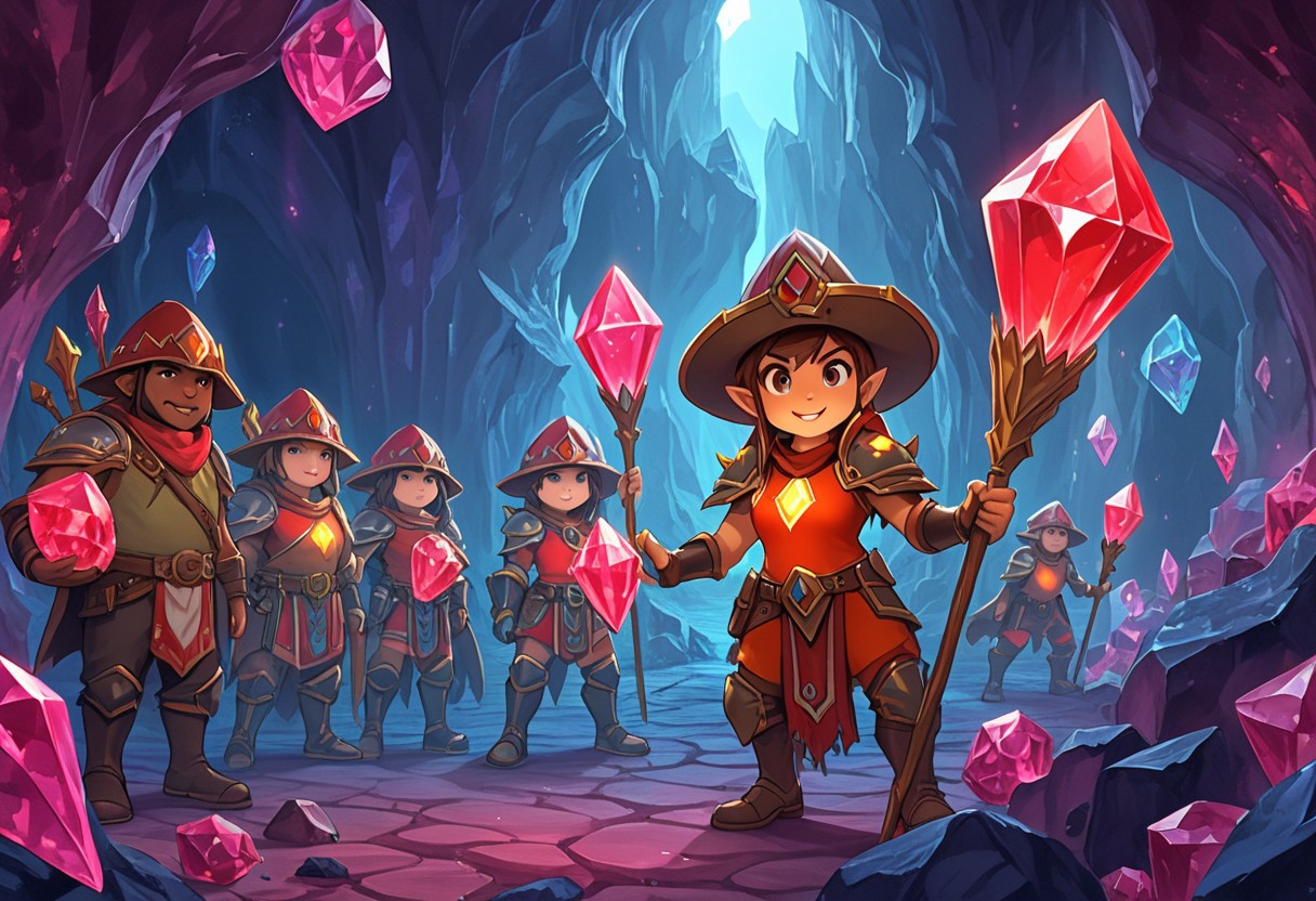 rp_slgd, advntr, Masterpiece award winning cartoonish illustration of a fantasy drawfs cavers, gemston cavern, bright colors created by the gems, fantasy illustration, adventurers in background, rating_pg