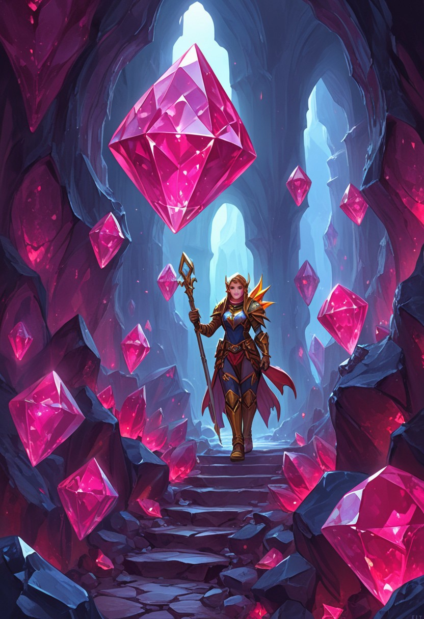 rp_slgd, advntr, Masterpiece award winning illustration of a fantasy drawfs cavers, gemston cavern, bright colors created by the gems, fantasy illustration,