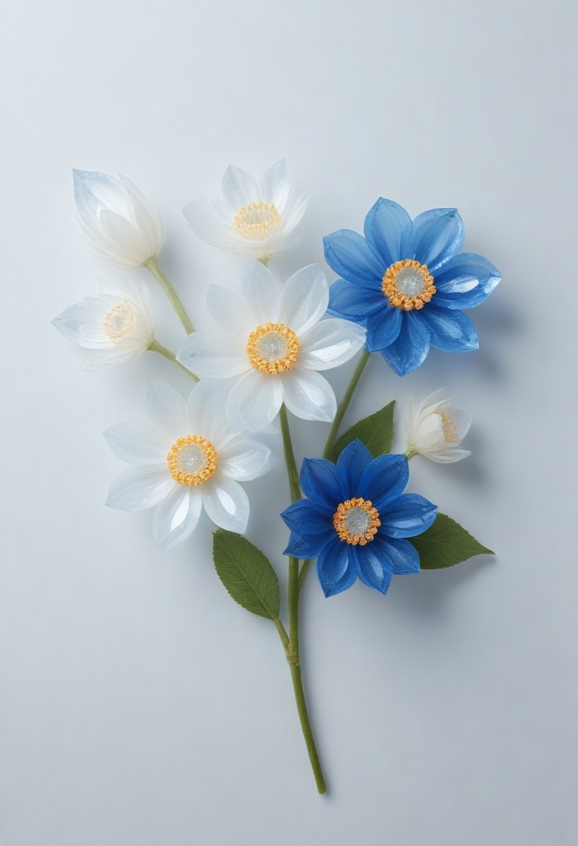 made of crystal, flatflower, flower, simple background, plant, blue flower, leaf, white flower, bouquet, still life,