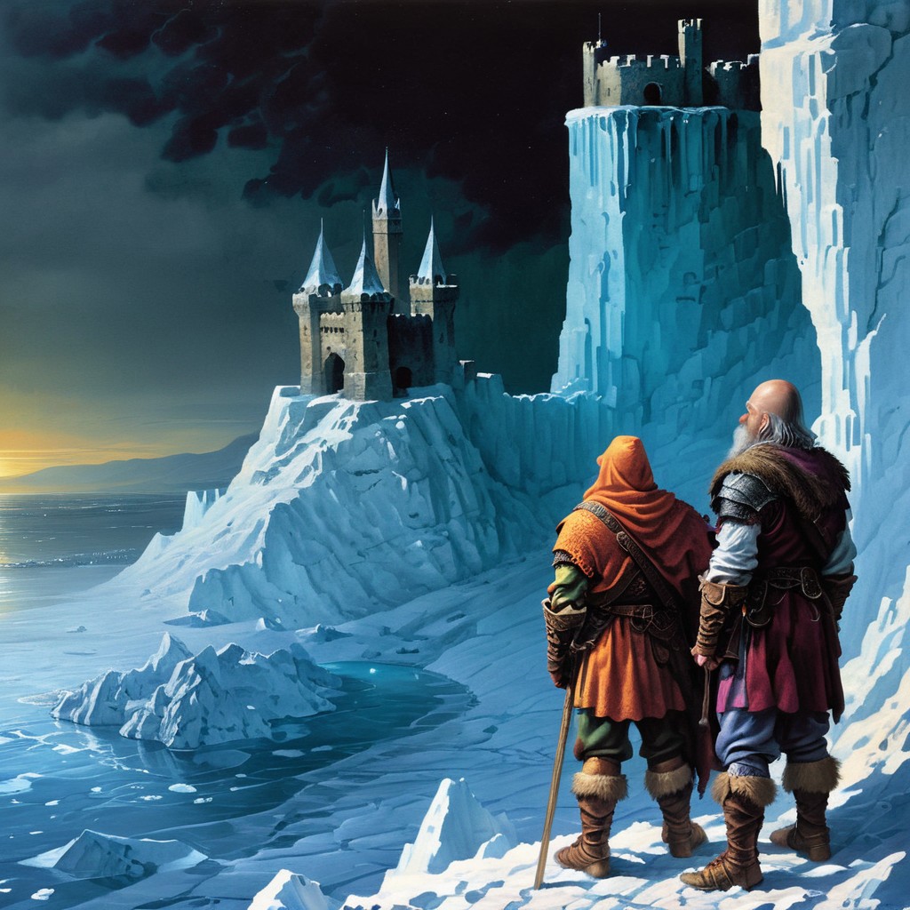 1970's dungeons and dragons dark fantasy artstyle, Two dwarfs standing at the edge of an icy cliff, watching the broken castle below, grain, cinematic, realistic, photo <lora:dark_fantasy:1>