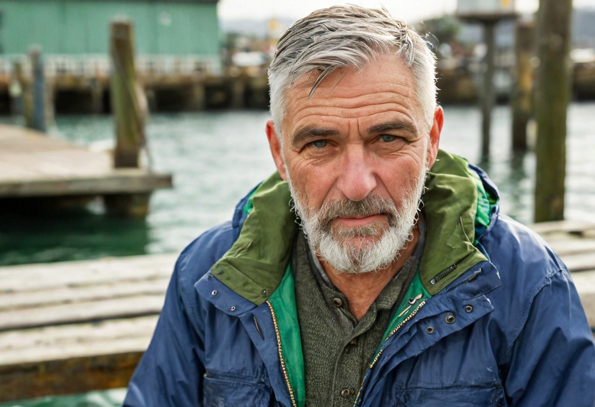 Portrait of a seasoned fisherman, with weathered skin, deep wrinkles, and a piercing gaze. He sports a short white beard and a fishermans Blue woolen binnie. He wear a waterproof green jacket.The background is a softly blurred dock, emphasizing his rugged features under natural light. National Geographic photo Style