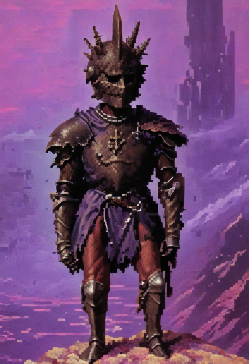 1970's dungeons and dragons dark fantasy artstyle, DnD_Grainyboyz, red-violet fog background, knight, long limbs, rusted copper gothic armor, helmet with two spiral horns, hold two big swords, one sword on shoulder, grainy, noise, cinematic, vintage, pixel art, photo <lora:dark_fantasy:1>
