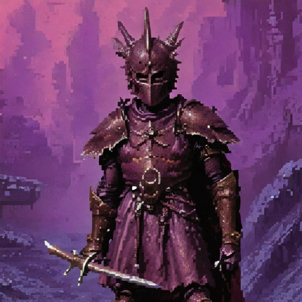 1970's dungeons and dragons dark fantasy artstyle, DnD_Grainyboyz, red-violet fog background, Daemonic knight, rusted copper armor, helmet with two spiral horns, hold two big swords, one sword on shoulder, grainy, noise, cinematic, vintage, pixel art, photo <lora:dark_fantasy:1>