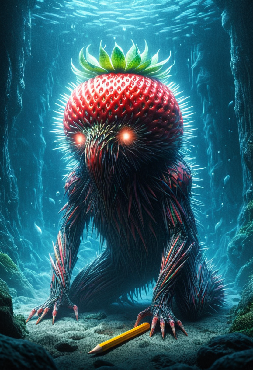 A dark fantasy 50mm wide draw of strawberry made of pencils and pencil-tips in a pencil_morph_style as a surreal world morph, set in A deep-sea abyss illuminated by eerie glowing creatures, a dynamic kneeling pose and an angry expression. The scene is illuminated by Ghostly fog illumination, enhancing the ethereal atmosphere. Eerie glowing symbols pulsing faintly on ancient stone. A captivating illustration, bursting with ultra-HD richness, refined textures, and an immersive 8K quality. Each detail is masterfully refined, encapsulating the essence of the scene in stunning resolution., structures and hairs and spikes and feathers are made out of pencils and pencil-tips, <lora:add-detail-xl:1>, <lora:Pencil_morph_style-000008:1.0>,