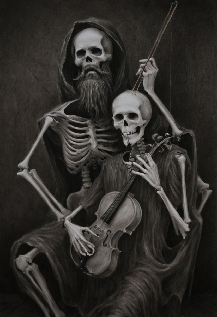 monoxxdr4ws, A dark, Monochromatic drawing of a self-portrait of a bearded, with a skeleton playing a violin looming behind him. Gloomy, surreal, macabre, unsettling atmosphere, high contrast, dark background, detailed linework, symbolic, charcoal drawing