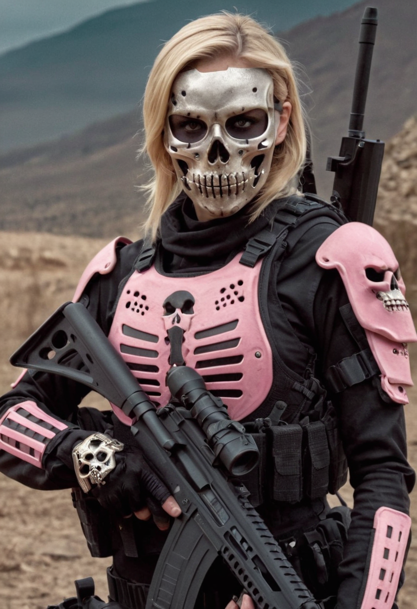 cinematic still D34THSQU4D, blonde woman wearing pink tactical gear, cute, girly, skull mask, armor, army, holding weapon, apocalypse war . emotional, harmonious, vignette, 4k epic detailed, shot on kodak, 35mm photo, sharp focus, high budget, cinemascope, moody, epic, gorgeous, film grain, grainy, D34THSQU4D, blonde woman wearing pink tactical gear, cute, girly, skull mask, armor, army, holding weapon, apocalypse war, holy, full exposed intricate, elegant, romantic, highly detailed, extremely fine detail, shining, sharp focus, divine illumination, cinematic, singular, dramatic, scenic, artistic, thought, elite, clear, crisp