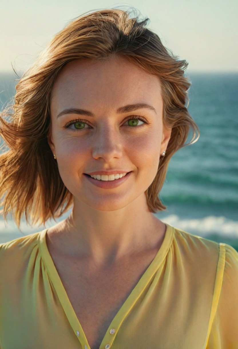 "Create a photorealistic 8K portrait of a 40-year-old beautiful woman ,natural face, real face, green eyes, subtle smile, short light brown hair, in mid-size body proportions. With a flowing Yellow blouse,Capture her features from multiple angles, emphasizing every detail, including fine lines, subtle skin imperfections, and authentic expression. Ensure that every strand of hair is rendered with unparalleled accuracy using advanced hair simulation techniques. Focus on capturing the play of light on her skin, using advanced lighting models to create a realistic atmosphere. The background should feature an ocean view in warm, natural tones, utilizing subtle gradient mapping to capture the environment's texture and color palette. Utilize Unreal Engine v5's latest features to render the image at 8K resolution, ensuring that it is not only visually stunning but also deeply immersive."