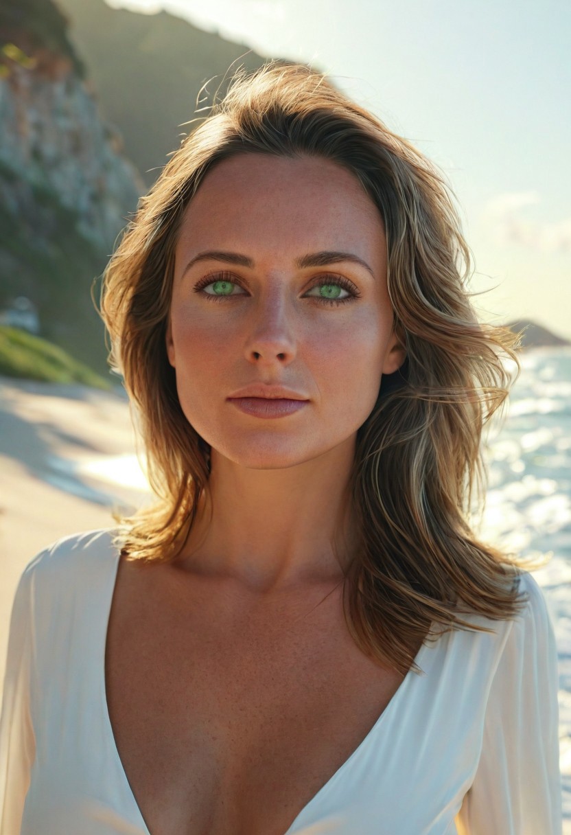 "Create a photorealistic 8K portrait of a 40-year-old beautiful woman , green eyes, in mid-size body proportions. With a flowing White blouse,Capture her features from multiple angles, emphasizing every detail, including fine lines, subtle skin imperfections, and authentic expression. Ensure that every strand of hair is rendered with unparalleled accuracy using advanced hair simulation techniques. Focus on capturing the play of light on her skin, using advanced lighting models to create a realistic atmosphere. The background should feature an ocean view in warm, natural tones, utilizing subtle gradient mapping to capture the environment's texture and color palette. Utilize Unreal Engine v5's latest features to render the image at 8K resolution, ensuring that it is not only visually stunning but also deeply immersive."