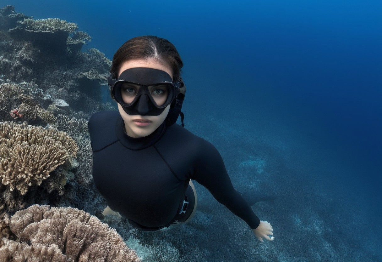 Medium shot of a beautiful woman wearing a french cut wetsuit and a black cressif1 dive mask swimming over a coral reef, facing down, looking at viewer, weight belt. BREAK high quality, high detail