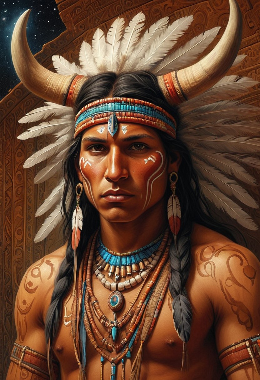 magnificent, celestial, ethereal, painterly, epic, majestic, magical, fantasy art, cover art, dreamy, extrem-close-up draw of little bull the native american, The Indian in the Cupboard,