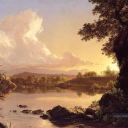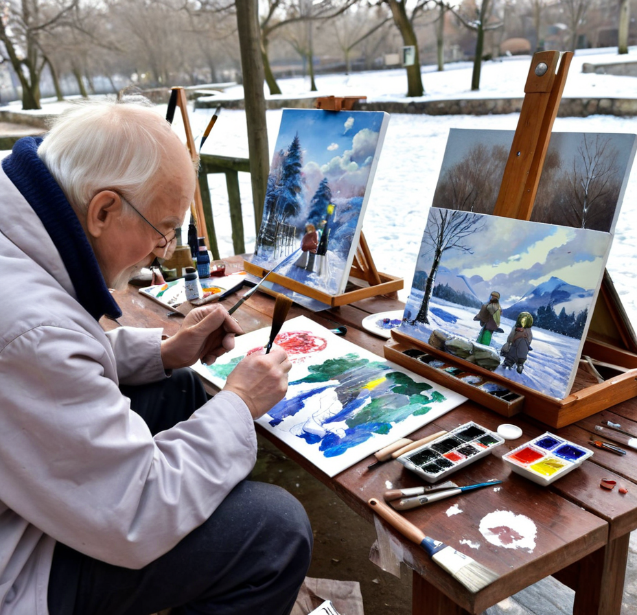 an old artist with painting tools is painting an anime detailed, outdoors in winter at a table