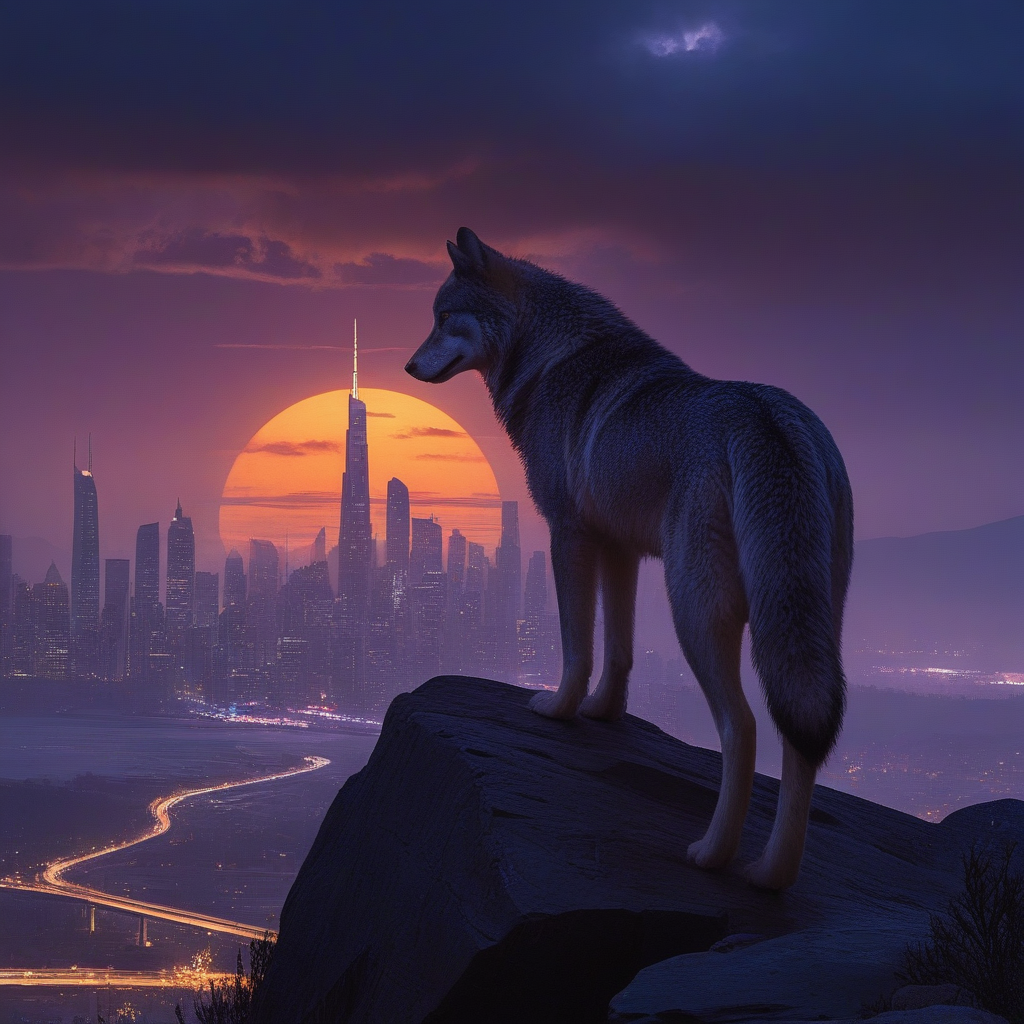 A majestic wolf standing on a rocky outcrop,overlooking a sprawling futuristic city at twilight. The wolfâs fur is (thick and wind-swept:1.3),with piercing amber eyes reflecting the cityâs neon glow. The cityscape below is a blend of (brutalist skyscrapers:1.2) and (futuristic glass towers:1.3),illuminated by (vivid neon lights:1.4) in electric blues,purples,and golds. The sky is a dramatic gradient of (deep indigo:1.2) and (fiery orange:1.3),with scattered clouds catching the last light of sunset. The scene is framed by (foreground pine trees:1.1) and a faint mist rolling in from the distance. Style: cinematic realism with hyper-detailed textures (wolf fur, city reflections, rocky terrain),(volumetric lighting:1.4),and a sense of awe-inspiring scale. Inspired by the works of (Caspar David Friedrich:1.2) and (Syd Mead:1.3).,âââ