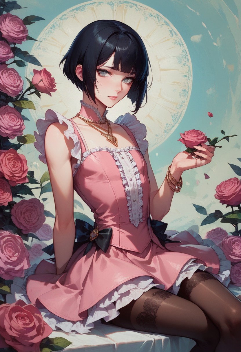 score_9, score_8_up, score_7_up, 1boy, femboy, otoko no ko, short hair, bob cut hair, black hair, grey eyes, gray eyes, feminine face, toned body, Shelly, pantyhose, ruffles, pink rose, thighhighs, flowers, rose corsage, sleeveless, necklace, jewelry, bracelet, pink dress, rose, ring, pink frilly dress, flower, lace trim, frilled dress, highly detailed, intricate, zzCitronCAT, flirty expression, sitting back, leaning back, legs crossed, hands in lap, looking at viewer, cowboy shot, modelshoot, abstract background, solo