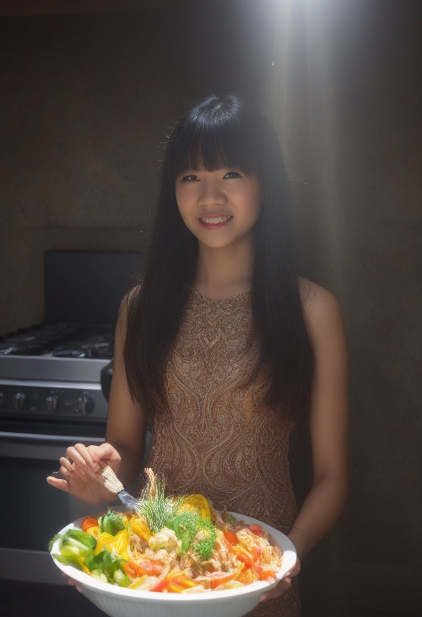 professional photo, 35mm film, kodak, nikon, analog, extremely realistic, full body shot, beautiful expressive eyes, gorgeous face, pretty girl, thai, (isometric room), (dark tan skin), intricate detail, food, kitchen, windows, (preparing food), ((cooking equipment)), unicorn, mermaid tail, naturally grown unicorn horn, long hairs, her hair is backlit by a rim light, mermaid dress, bangs, volumetric lighting, detailed shadow, sun, looking at viewer, meat, vegetables, (dark background and deep shadows), chindopanlok