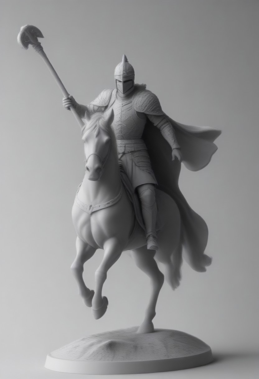 masterpiece, art style, WhiteMold, knight, holding a poleaxe, riding a horse, cape, ultra detailed, 3d printed mold, no humans, nobody, black background