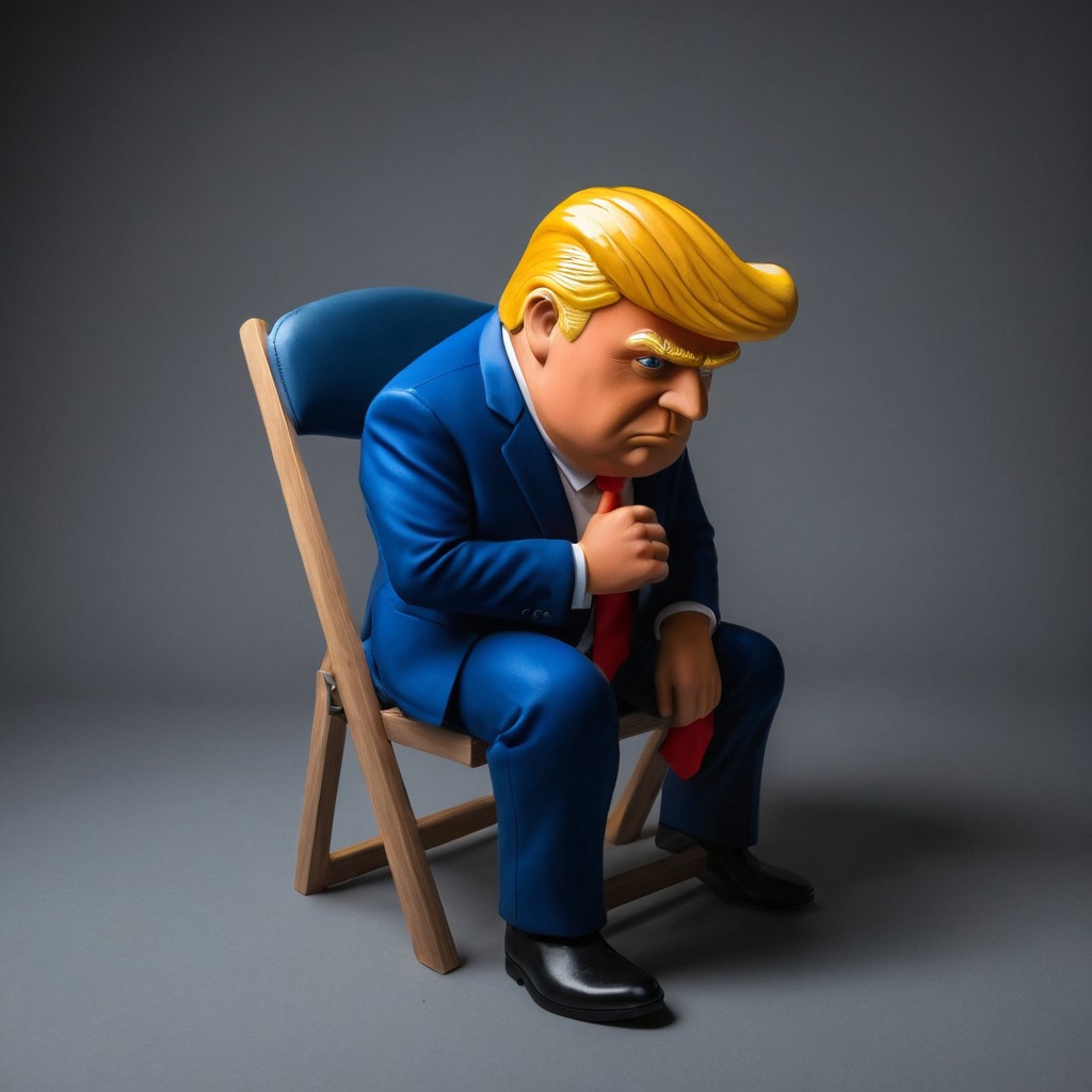 dramatic, sharp outlines, high contrast, masterpiece, ultra detailed, fine details, intricate, realistic details, smooth textures, room lighting with soft reflections, cinematic composition, ultra-high resolution, dynamic depth of field, portrait, Trump sitting on a chair holding his head with his hands, sitting,folding chair, sfw, in blue suit,