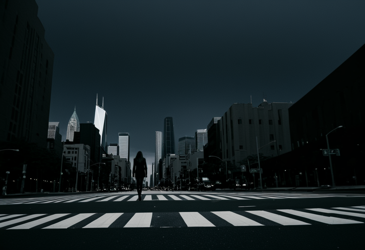 RAW photo, high quality from below of a huge cityscape, vast city with crosswalks,city skyline silhoette, in <lora:Chiaroscuro Lighting Style:0.2> Chiaroscuro Lighting Style,<lora:Black_Purple:0.3> Everything in black, black color aesthetic, black theme, <lora:Bespin:1.0> Bespin, featuring <lora:training_model:0.8> rnewe,<lora:metroplex:0.2> city,cityscape <lora:SDS_Contrast tool_XL:1.0>,