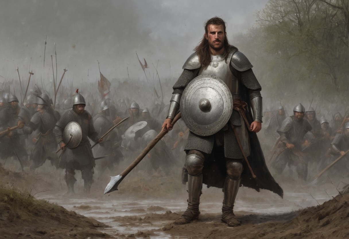 (medieval_warrior:1.4) holding (battle_axe:1.6) and (round_shield:1.5), (chainmail_armor:1.3), (axe_head:1.6) with (serrated_edge:1.4), (steel_reinforced_shaft:1.3), (shield_boss:1.2) with (dragon_engraving:1.4), (muddy_battlefield:1.5), dynamic_action_pose, splattered_mud, ultra_detailed_weapons, historical_authenticity, 8k, by Greg Rutkowski