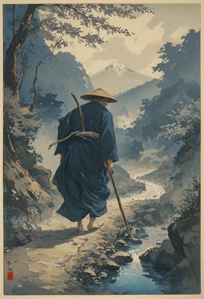 Japanese woodblock print, ukiyo-e style, by Katsushika Hokusai – A lone Buddhist monk traverses a narrow mountain path, his straw hat tilted downward as he leans on a wooden staff. His flowing robe, rendered in deep indigo and soft gray tones, billows slightly in the wind, its folds captured with delicate, fluid brushstrokes. Below, a river winds through a valley, its surface broken by scattered stones and swirling currents. In the distance, Mount Fuji rises, its peak shrouded in mist, framed by a sky streaked with curling clouds. The composition balances movement and stillness, with the monk’s quiet journey set against the vastness of the landscape, evoking a sense of solitude and spiritual resolve. Niji, aidma-niji
